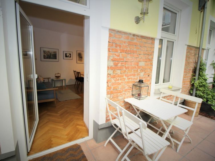 "City Oase Garden", appartement 2-kamers 43 m2, op de begane grond. Ruim, volledig gerenoveerd in 2017, doelmatig en modern ingericht: open hal. 1 kamer met 1 2-pers bed. Groot, open woon-/slaapkamer met 1 2-pers divanbed (120 cm, lengte 200 cm), eettafel. Uitgang naar de tuin, naar het terras. Woonkeuken (oven, afwasmachine, 4 keramische glas kookplaten, broodrooster, waterkoker, elektrische koffiemachine). Badkamer, aparte WC. Parketvloeren. Terras, tuin 50 m2. Terrasmeubelen. Ter beschikking: wasmachine, haardroger. Internet (WiFi, gratis). Geschikt voor families appartement aan de binnenplaats. Niet rokers woning.