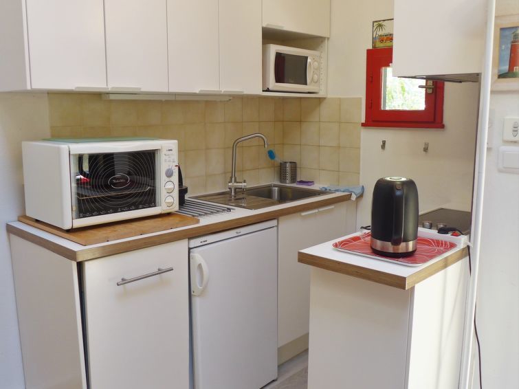 Huis in een rij 2-kamers 33 m2 op 2 verdiepingen. Woon-/eetkamer met 1 divanbed (120 cm, lengte 190 cm), TV en Flatscreen TV. Kookhoek (oven, afwasmachine, 2 keramische glas kookplaten, magnetron, elektrische koffiemachine, pads voor de koffiemachine (Nespresso) extra). Badkamer, aparte WC. Bovenverdieping: 1 kamer met 1 2-pers bed (1 x 140 cm, lengte 190 cm). 1 kamer met 1 bed (90 cm, lengte 190 cm). Elektrische verwarming. Terras 13 m2, op het oosten gelegen, zithoek in de tuin. Terrasmeubelen, barbecue. Ter beschikking: wasmachine, strijkijzer, haardroger. Internet (WiFi, extra). Parkeerplaats nr. 315. Niet rokers woning. Rookmelders. In plaats van een afgesloten slaapkamer bevinden sommige slaapgedeeltes zich in een open ruimte (galerij, nis, etc.).