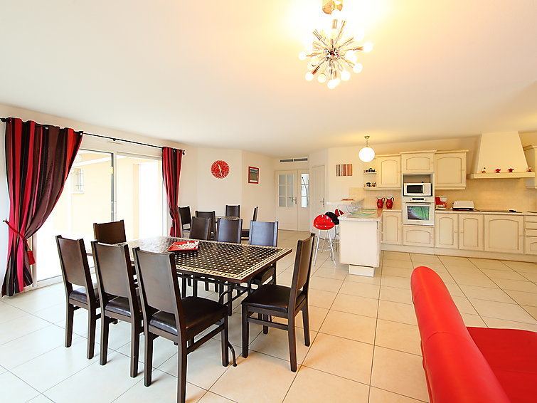 Villa 5-kamers 140 m2. Comfortabel ingericht: woon-/eetkamer met TV, Sat-TV en internationale TV-zenders (Flatscreen TV), radio en DVD. Uitgang naar de tuin, naar het terras. 1 kamer met 1 2-pers bed (160 cm, lengte 200 cm), douche/WC. Uitgang naar de tuin. 1 kamer met 1 2-pers bed (160 cm, lengte 200 cm). Uitgang naar de tuin. 1 kamer met 1 2-pers bed (160 cm, lengte 200 cm). 1 kamer met 2 bedden (90 cm, lengte 190 cm). Open keuken (4-pits kookplaat, oven, afwasmachine, broodrooster, waterkoker, magnetron, diepvriezer, elektrische koffiemachine, pads voor de koffiemachine (Nespresso)) met bar. Bad/WC, aparte WC. Air-conditioning, heteluchtverwarming. Terras 47 m2, op het zuiden gelegen. Terrasmeubelen, ligstoelen. Ter beschikking: wasmachine, strijkijzer. Internet (Internet (WiFi), gratis). Parkeerplaats (1 Auto), garage (1 Auto). Rookmelders.