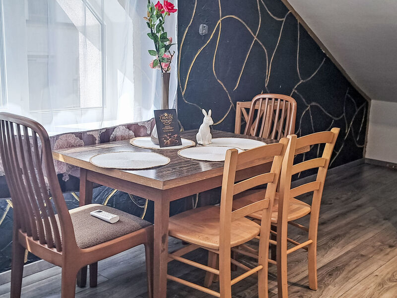"Siebter Himmel", appartement 2-kamers 55 m2. Het objekt is geschikt voor 2 volwassenen + 2 kinderen. Modern en smaakvol ingericht: hal. Woon-/eetkamer met eettafel, eethoek en Sat-TV. 1 2-pers. kamer. Open keuken (oven, afwasmachine, 4 inductiekookplaten, magnetron, elektrische koffiemachine). Douche/WC. Ter beschikking: wasmachine. Internet (WiFi). 1 huisdier/hond toegestaan. 53104/9757