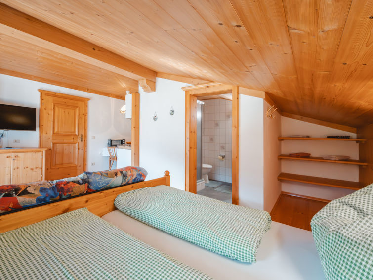 "Weissbacher", appartement 1-kamer 28 m2 op de 1e verdieping. Gezellig en met veel hout ingericht: woon-/slaapkamer met 1 2-pers bed, eettafel en eethoek. Kookhoek (2-pits kookplaat, oven, waterkoker, elektrische koffiemachine). Douche/WC. Verwarming. 1 huisdier/hond toegestaan. 50620-000788-2022